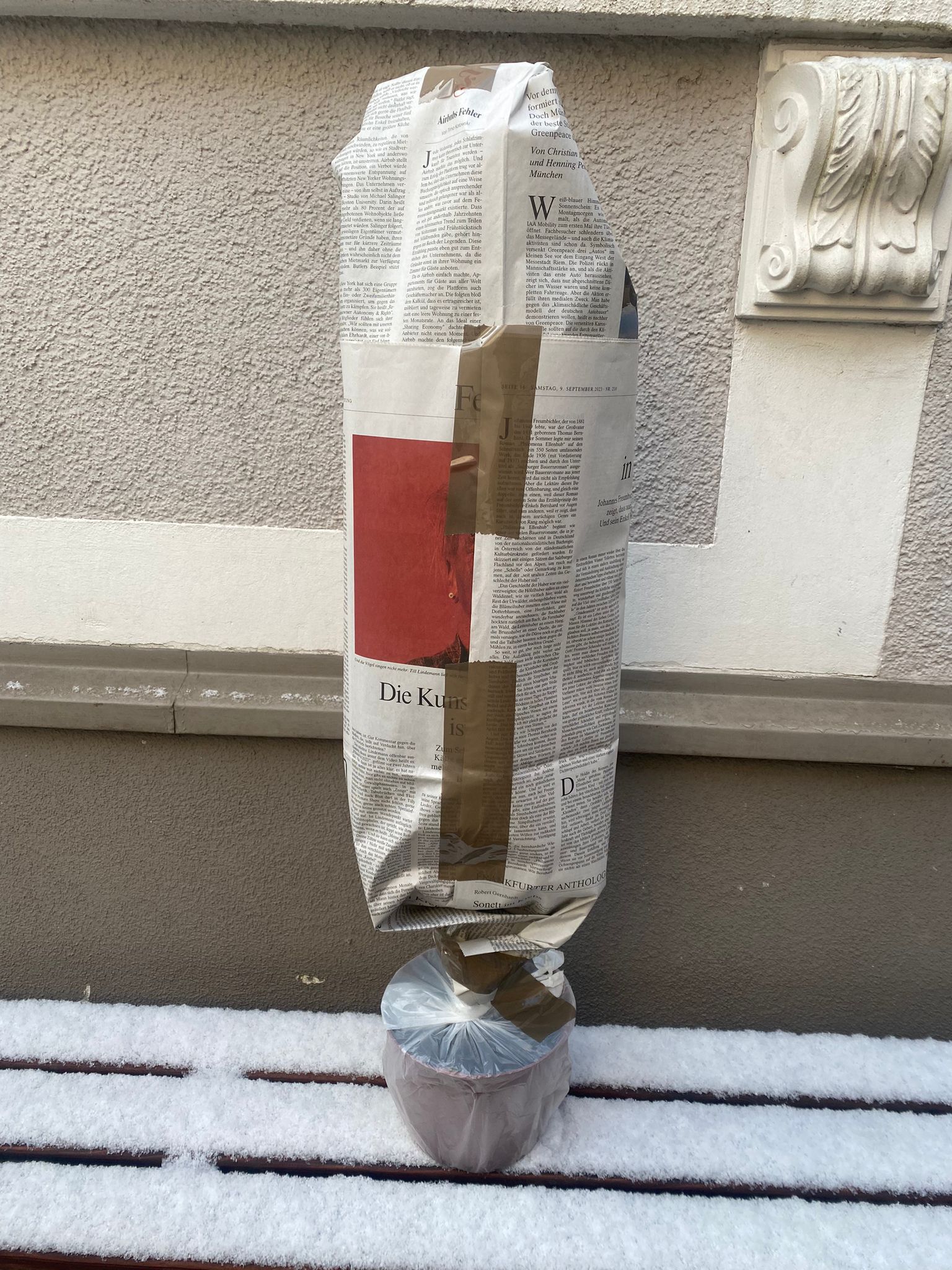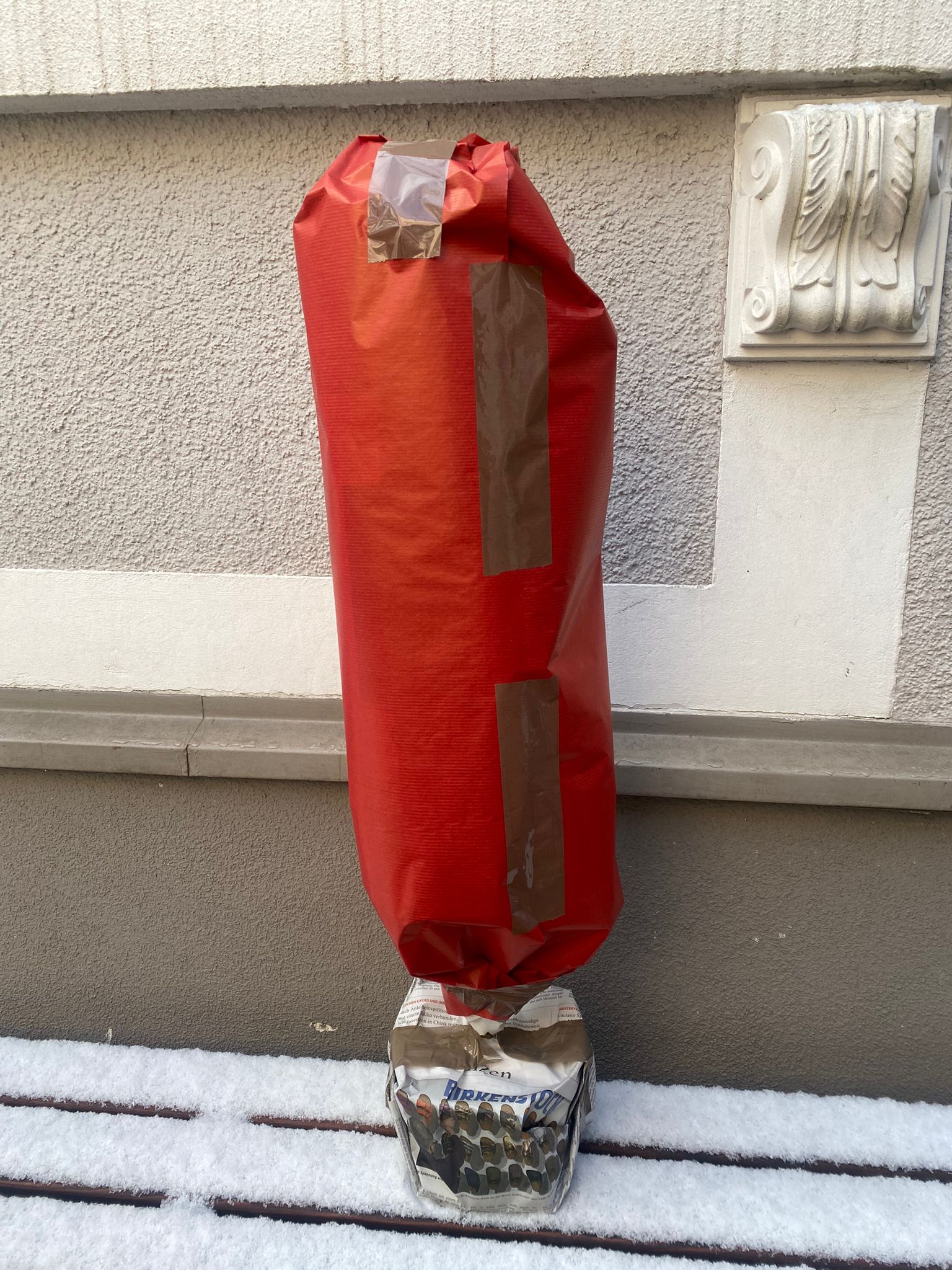 Anschließend wird die Kamelie sorgfältig in Zeitungs- oder Packpapier dick eingepackt, damit Blätter, Knospen und Blüten gut geschützt sind.