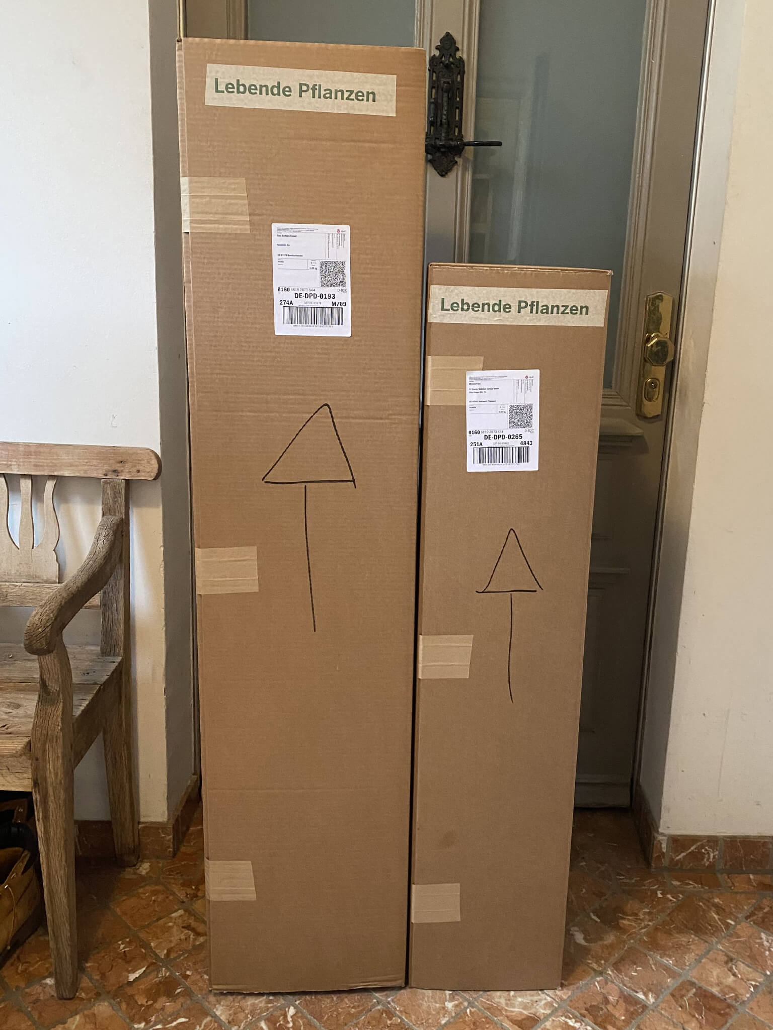 Jede Pflanze wird vor dem Versand gründlich gewässert. Danach wird der Pflanztopf mit einer Plastiktüte umhüllt, um ein Austrocknen des Wurzelballens zu verhindern.